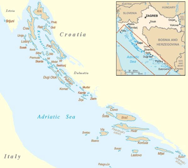 Pag, Premuda, Vir, Malat, Ugljan, Murter, Dugi Otok, Kornat, Sestrunj, Kaprije, Žirje